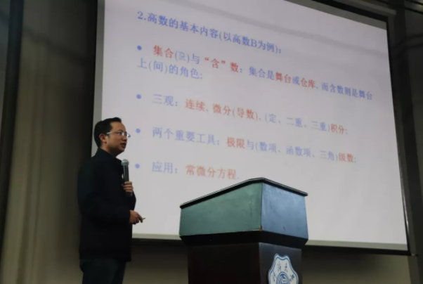 讲座开场,杨老师风趣幽默为同学们揭开高等数学的神秘面纱。 随后,杨老师以高等数学B为例,简明扼要地将其主要内容概括为集合与“含”数、三观、两个重要工具与应用。他将微积分与认识世界的三观结合起来,利用令人印象深刻的“幸福公式”分别解释了连续、可微、可导的概念。杨老师总结了同学们包括心态障碍、方法差异、学习态度在内的常见高数学习问题,并指出态度才是考试通过率低的决定性因素,希望同学们都能信心满满地迎接挑战。