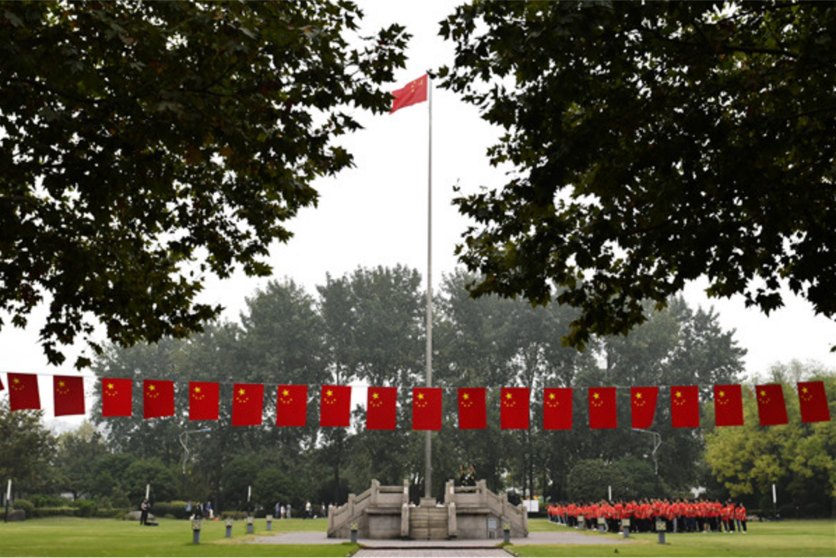能源与电气学院王琛、企业管理学院刘伟超代表全校师生庄严表示“奋斗有我,壮志在我,强国有我”,我们将深入学习贯彻习近平新时代中国特色社会主义思想,把“小我融入大我”,坚持不懈奋斗,努力练就本领,勇做走在时代前列的奋进者、开拓者、奉献者。随后,师生们挥动国旗,深情合唱《歌唱祖国》。