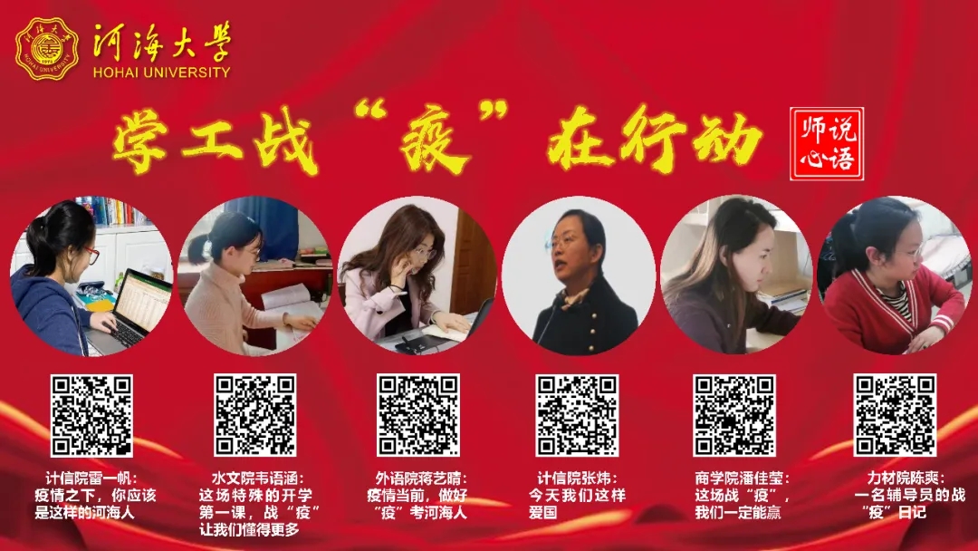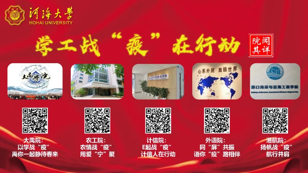 发出网络最强音。疫情发生伊始,学校学工新媒体平台就开通“师说心‘语’·河力抗‘疫’”和“院闻其详·齐心战‘疫’”专栏,以笔为援,以文化人。“今天我们这样爱国”“全体辅导员给同学的一封信”“疫情当前,做好‘疫’考河海人”“农情战‘疫’,用爱‘宁’聚”“以学战‘疫’ 禹你一起静待春来”……一篇篇动情入理的网文,将防疫战斗中一个个无畏无惧的背影、一颗颗紧密相联的爱心、一段段平凡又伟大的故事转化为生动的教育素材,成为定期推送给广大同学的精神食粮。计信院辅导员雷一帆老师线上组织“风雨同舟、共战疫情”“声援武汉、加油中国”“绘战疫情”等网络活动,其中“学雷锋,助抗疫”活动获江苏工人报登载宣传。在“高校辅导员联盟”公众号发表《疫情之下,你应该是这样的大学生》微信文章。外语院辅导员蒋艺晴老师动员辅导员共同参与撰写网文《亲爱的同学,惦念大家的河海辅导员想对你说》等温馨信件。学生处通过“河海学工在线”微信平台在3月8日推发温情网文《感谢有她丨点赞这群美丽、可爱的“女神”辅导员们》。