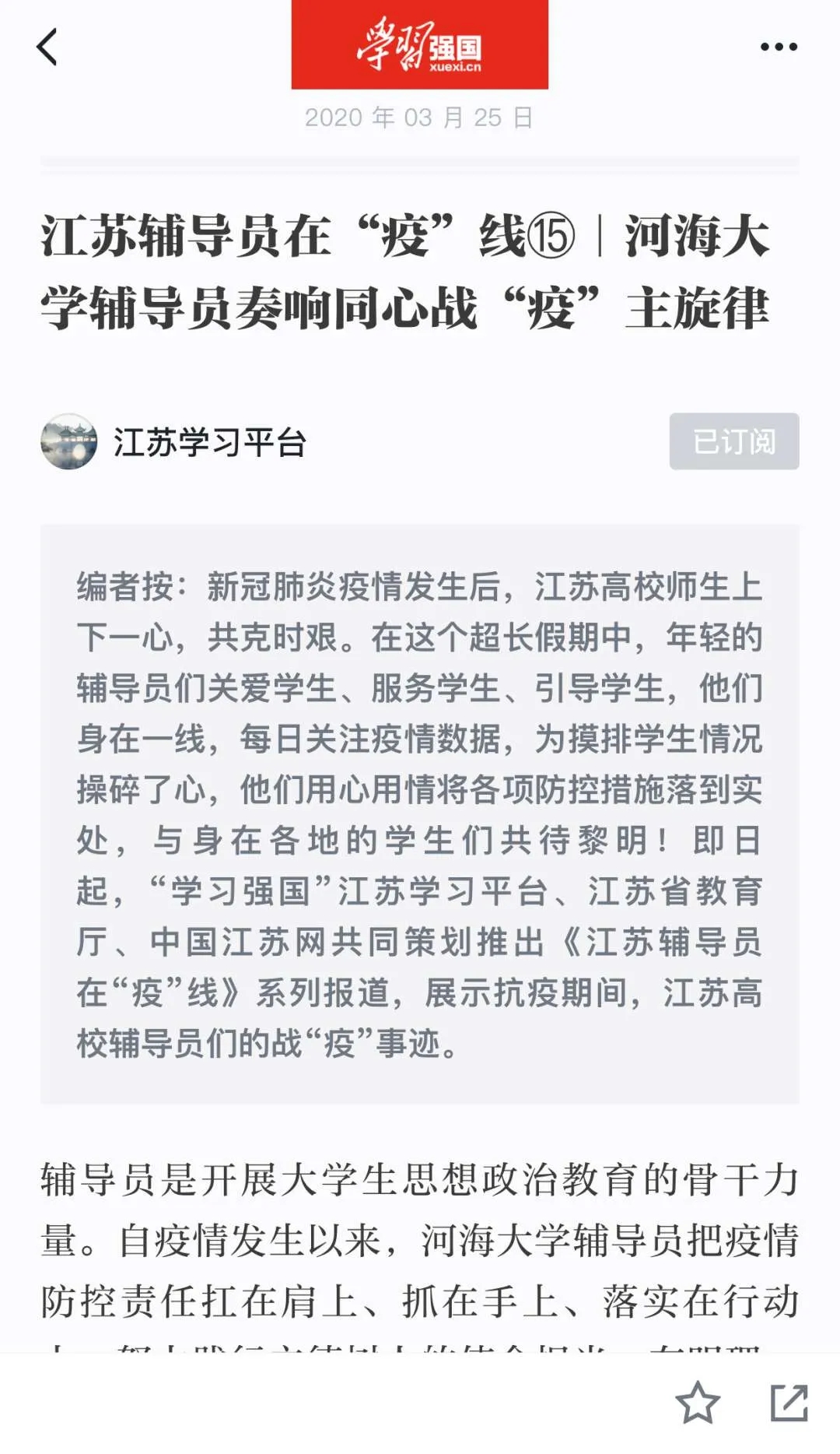 今天,“学习强国”江苏学习平台、“江苏高校辅导员”微信平台报道河海辅导员们的战“疫”事迹:《AG凯发K8国际辅导员奏响同心战“疫”主旋律》
