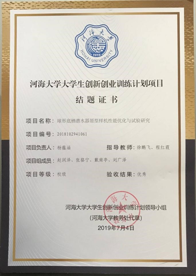 杨蕴涵对科研的兴趣始于大一下学期,她参加了大学生创新创业训练计划,主持了“球形底栖潜水器原型样机的性能优化与研究”项目。在项目中,杨蕴涵担任组长,负责潜水器原型样机的建模工作,主要使用机械设计软件SolidWorks进行三维建模。许多构件都是在一次次迭代优化中逐渐完善的,再用3D打印机打印模型,组装零部件。在这些过程中,她逐步发现,许多零部件设计的不尽合理,比如在空间上存在碰撞问题,在结构上很多时候受力不尽合理,她在SolidWorks软件分析其受力状态,逐步完善其设计,直到获得成品。最后,此项目获评校级优秀结题。大三学年杨蕴涵参与了第二项创新训练项目“基于航道整治疏浚砂的新型砂性混凝土研究”,在此项目中主要负责实验操作、成果分析。他们小组以节能环保为目标,探索将长江中下游疏浚砂二次利用制成新型高性能砂性混凝土的方法。在这个项目中她充分锻炼了实验操作能力,极大地提高了对混凝土成形、养护等流程的认知,并了解了一些环保混凝土的前沿科研内容。在参与科研项目的期间,杨蕴涵获得了多项专利成果,包括两项发明专利和三项实用新型专利。