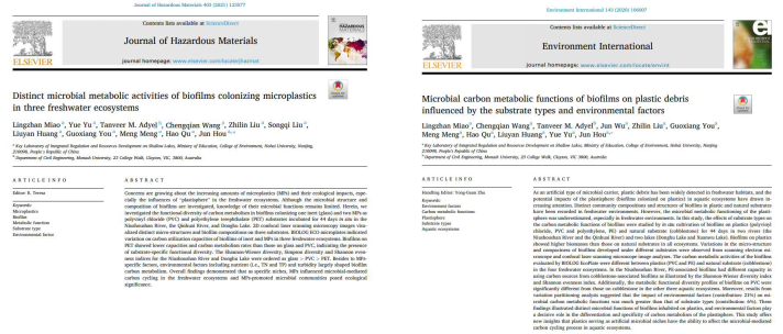 如果说课内学业是于越同学的主战地,那竞赛和科研就是他的训练场。于越同学在“外研社杯”全国英语大赛、“LSCAT”杯江苏省笔译大赛等学科竞赛中均斩获佳绩。同时,他能够深刻认识到环境科学是一门极具综合性和实践性的学科,需要他主动了解学习跨专业领域知识,努力开拓自身视野,将自身知识向宽领域、多层次方向发展。因此,在大二上学期,于越同学就积极联系导师参与到科研项目中。在导师的指导下,于越和他的研究队员很快就聚焦在当时热点环境问题——微塑料的环境效应,并展开深入研究。通过野外原位培养、实验室检测以及数据分析,最终在附着于微塑料介质的生物膜群落功能多样性分析项目中取得成果。其中由于越主笔撰写的《Distinct microbial metabolic activities of biofilms colonizing microplastics in three freshwater ecosystems》在Journal of Hazardous Materials期刊上发表,参与撰写的《Microbial carbon metabolic functions of biofilms on plastic debris influenced by the substrate types and environmental factors》在Environment International期刊上发表。这段科研经历为于越同学的科研探索之路打下了牢固的基石,也鼓舞他继续砥砺前行。