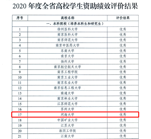 2021年11月30日,江苏省教育厅、江苏省财政厅发布《关于公布2020年度全省学生资助绩效评价结果的通知》(苏教助函〔2021〕19号),我校再次荣获江苏省学生资助绩效评价“优秀”。