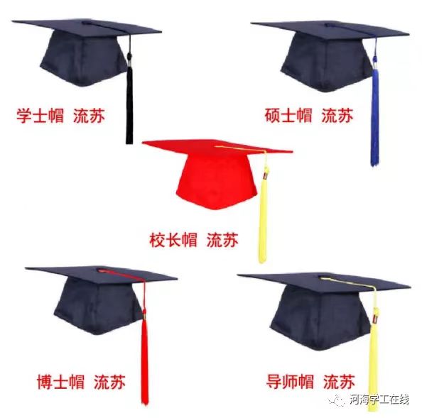 校(院、所)长帽流苏为黄色。校(院、所)长、学位评定委员会主席及委员(或导师)及已获学位者,其流苏均垂在所戴学位帽的左前侧中部。博士学位流苏为红色,硕士学位流苏为深蓝色,学士学位流苏为黑色;学位授予式上,应保持流苏挂在帽顶的帽结上,沿帽檐自然下垂。