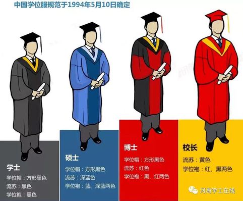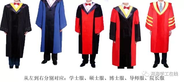 校长服为红、黑两色;博士学位袍为黑、红两色,硕士学位袍为蓝、深蓝两色,学士袍为黑色;穿着学位袍,应自然合体,学位袍外不得加套其他服装。