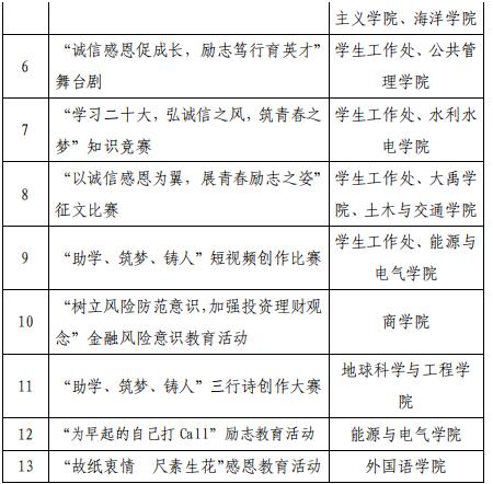 根据《关于大力开展 2023年高校学生资助诚信教育主题活动的通知》(教助中心〔2023〕13号)要求,我校将以习近平新时代中国特色社会主义思想为指导,认真贯彻落实习近平总书记关于教育的重要论述,全面贯彻党的教育方针,紧紧围绕立德树人根本任务,坚持把促进家庭经济困难学生成长成才作为学生资助工作的出发点和落脚点,将学生资助工作与思想政治工作紧密结合,加强对家庭经济困难学生的诚信教育、感恩教育和励志教育,增强学生诚信意识、风险意识和感恩意识,引导树立正确的消费观、成才观和价值观,努力把家庭经济困难学生培养成为德智体美劳全面发展的社会主义建设者和接班人。经研究,决定开展AG凯发K8国际第十一届诚信·励志·感恩主题教育月活动,现就有关事宜通知如下: