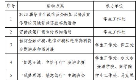 3、突出主题,强化实效。积极宣传各项国家、学校相关资助政策,普及银行征信、金融风险防范等相关知识,将诚信教育融入学生日常管理,以学增智,以知促行,有效将教育成果转化为大学生的自觉素养与行为,培养学生树立诚信观念,珍惜个人信用,增强法律意识和契约精神。要建立健全日常监测机制与学生网络征信档案体系,密切关注学生异常消费行为,努力做到早防范、早教育、早发现、早处置。