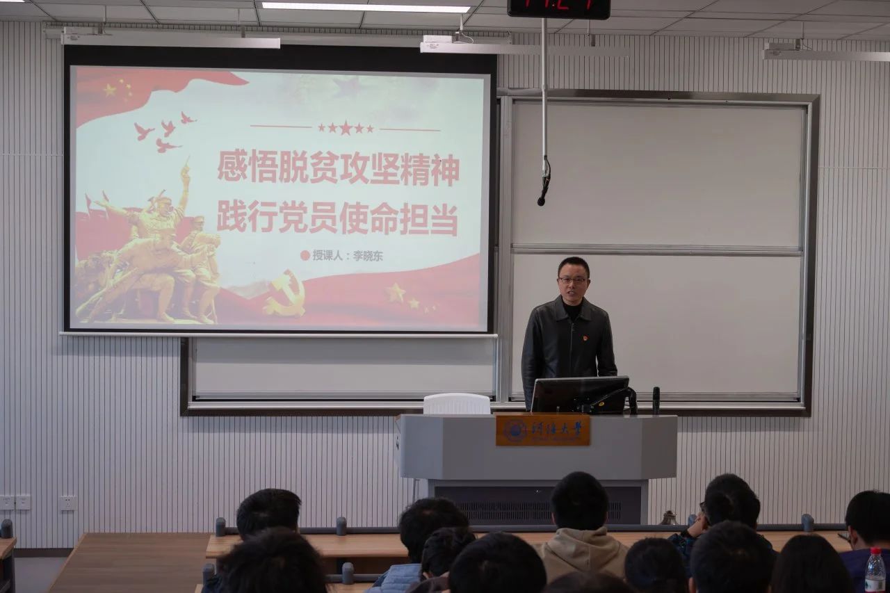 参观结束后,“江苏省脱贫攻坚先进个人”李晓东结合自己在石泉县池河镇五爱村担任驻村第一书记的经历,从“脱贫攻坚的时代价值”、“脱贫攻坚中党员的作用发挥”以及“党员应当具备的素质修养”三方面为青年学子讲授《感悟脱贫攻坚·践行党员使命担当》微党课。帮助青年学子深刻领悟脱贫攻坚精神,深刻体会我国创造了完成消除绝对贫困这一彪炳史册的人间奇迹,深刻明晰中国共产党人的责任和担当。
