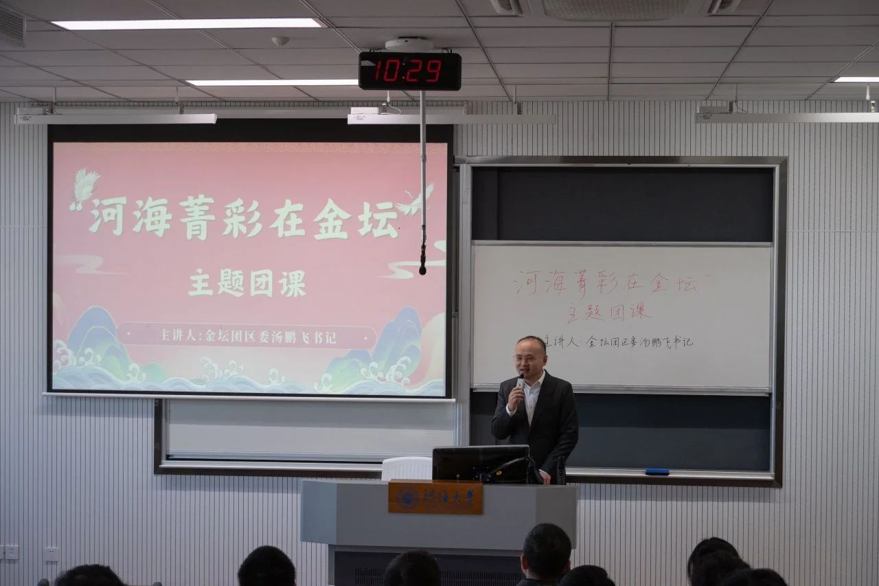调研结束后,金坛区委统战部副部长、团区委书记、区工商联党组书记汤鹏飞为师生讲授“河海菁彩在金坛”主题团课。他代表金坛青年向河海学子们发出热情洋溢的欢迎和诚挚邀请,并从金坛“有山、有水、有诗、有茶、有酒、有盐、有梦想、有诚意、有未来”等9方面向师生们详细讲诉了金坛这片土地的红色底蕴、文化传承、发展现状和时代风貌,为大家描绘了河海在金坛的美好前景。