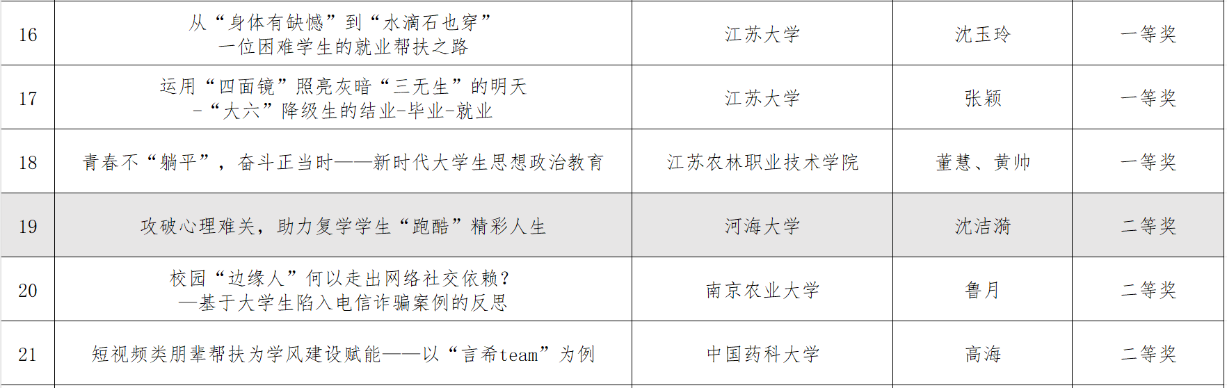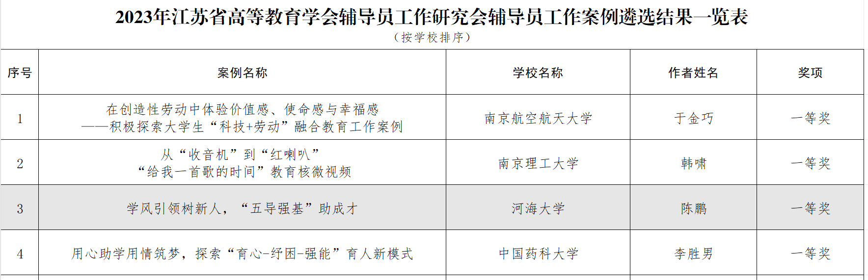 在江苏省高等教育学会辅导员工作研究委员会公布的2023年度辅导员工作案例遴选结果中,我校申报的《学风引领树新人,“五导强基”助成才》《攻破心理难关,助力复学学生“跑酷”精彩人生》两个案例分别斩获一等奖和二等奖。