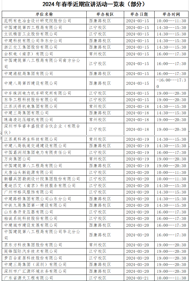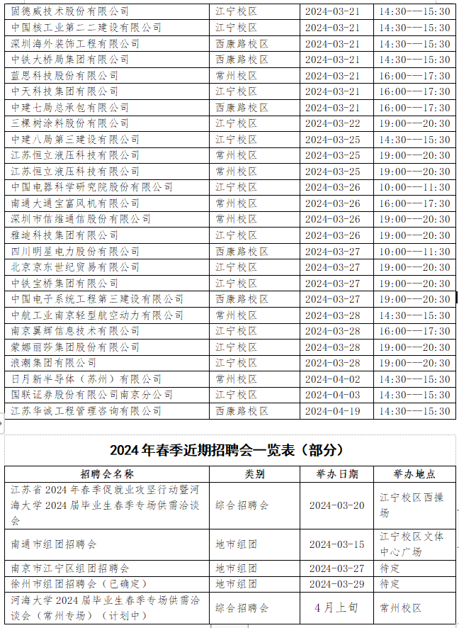请各位同学及时关注AG凯发K8国际就业微信公众号“河海就业hhjy”、AG凯发K8国际就业信息网:https://hhu.91job.org.cn/,关注最新招聘信息和就业指导服务安排。我们摘录编制了学校2024年春季近期部分宣讲招聘活动一览表(见附件),请各位同学积极参加!