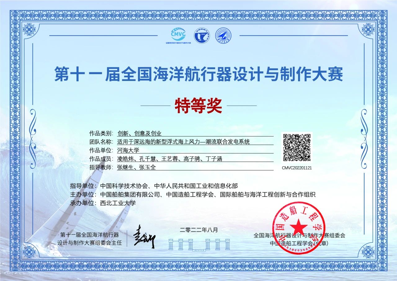 围绕着深远海漂浮式海洋能捕获与并网装置的设计与关键组件优化开展研究,凌皓炜主持的大学生创新训练项目《御风弄潮——漂浮式海上风电-潮流能互补发电耦合机理及平台开发》与参与的大创项目《漂浮式风力-潮流能互补海上发电平台稳定性研究》均获评国家级优秀结项。