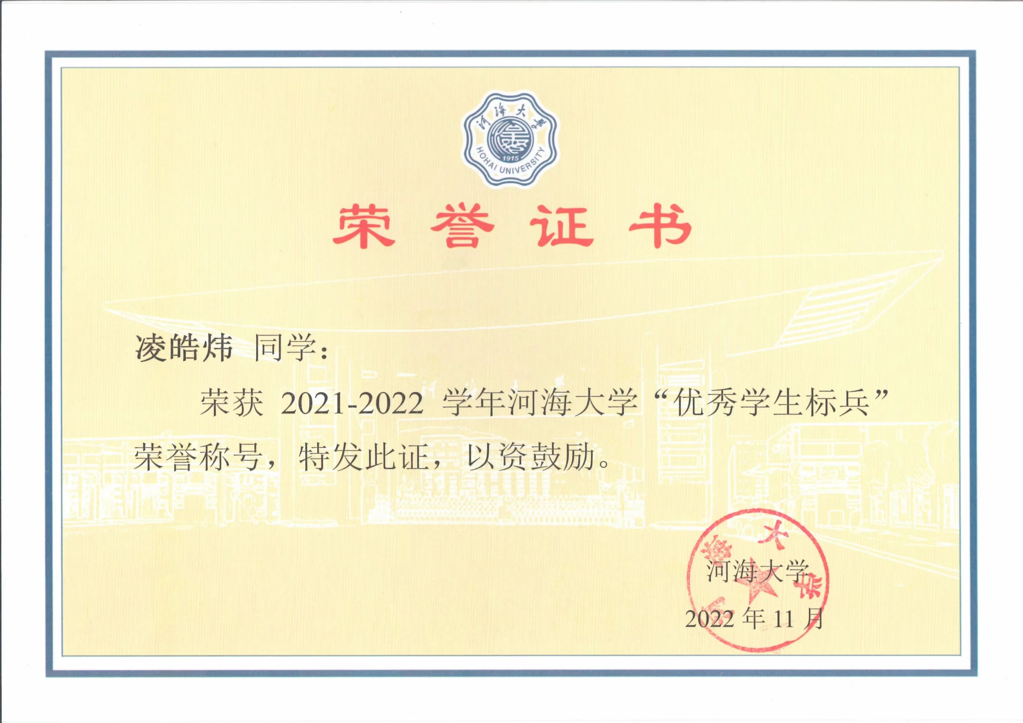 怀揣治水报国的理想,凌皓炜同学不断将专业知识与行业需求相结合,参与的《脱贫兴 治水定 家国情——探寻“王家坝精神”主题实践》获得第十七届“挑战杯”全国大学生课外学术科技作品竞赛红色专项活动江苏省选拔赛一等奖。参与的《探伤专家——水利工程智能缺陷监测设备领航者》获得第八届中国国际互联网+大学生创新创业大赛江苏选拔赛一等奖。