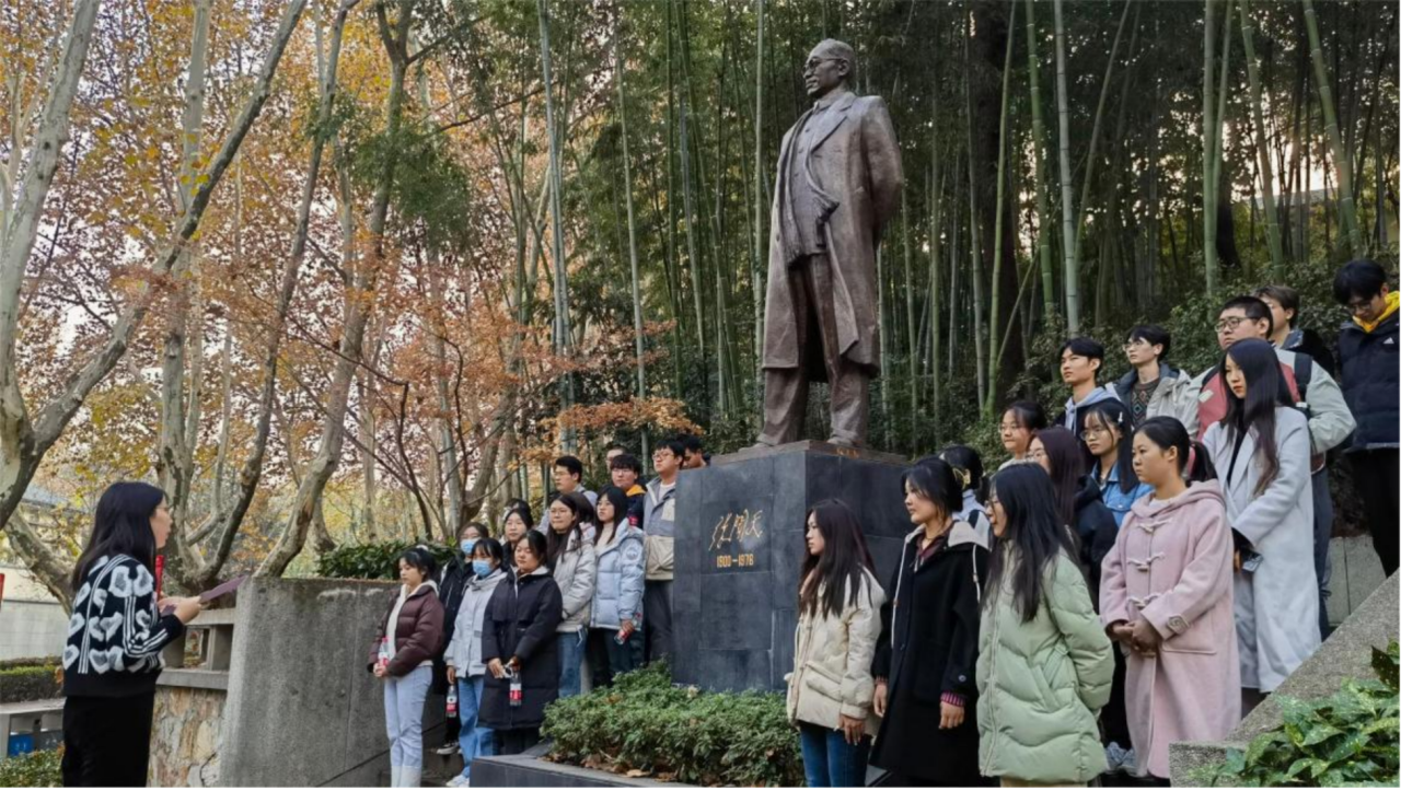 在张闻天铜像前,商学院2021级陆睿涵同学给同学们带来了一堂沉浸式实地团课,将张闻天在河海开启光辉革命生涯的奋进故事娓娓道来。面对铜像,同学们诉说着对张闻天的景仰和奋进新征程的热血。信仰的力量跨越时空召唤年轻的我们,凝聚集体星火传承闻天精神,唱响青春之歌争做时代新人。
