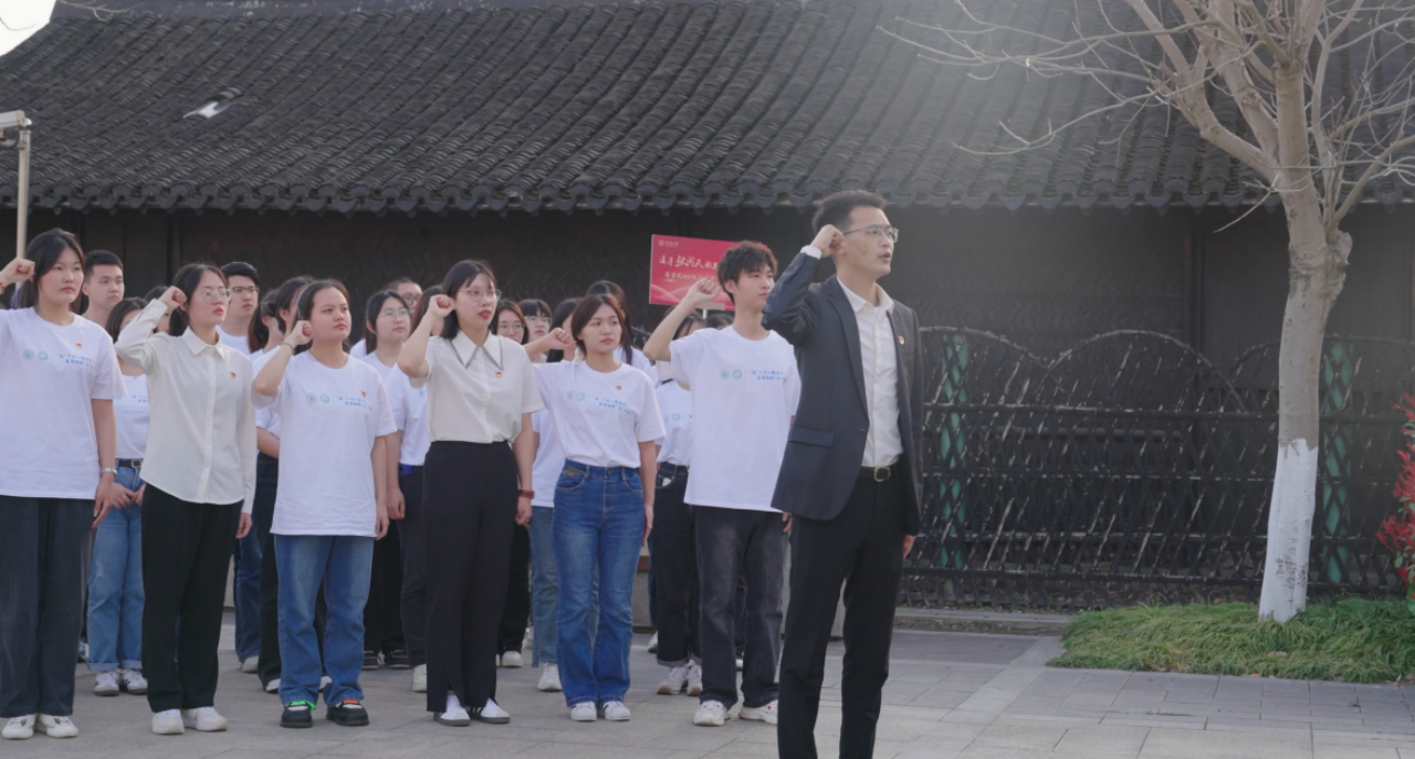 座谈交流会后,学生代表在张闻天铜像前敬献鲜花,表达对张闻天的尊敬与缅怀。在商学院2021级辅导员陈鹏老师的带领下,党员同志在誓词墙前重温入党誓词,牢记初心使命。最后,同学们从张闻天的事迹中汲取力量,在故居的各个角落喊出“传承有我”的誓言,将传承闻天精神的坚定信念布满这个岁月沉淀的地方,以青年之声诉说百年星火传承。