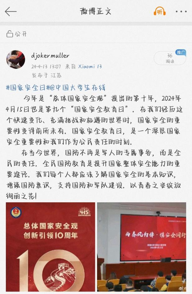 开展“微博#国家安全日#话题”互动。组织学生观看由国家开放大学联合“央视频”推出国家安全系列公开课,学习了解国家安全的重要性,深刻认识维护国家安全是每个公民义不容辞的责任与义务。