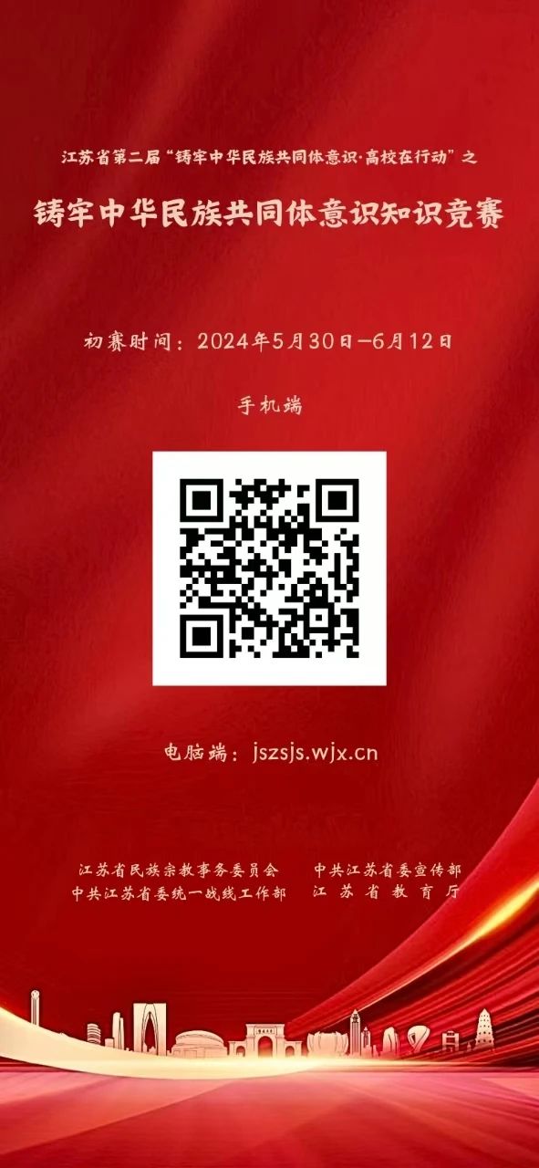 根据省民宗委、省委宣传部、省委统战部和省教育厅《关于开展江苏省第二届“铸牢中华民族共同体意识·高校在行动”系列活动的通知》(苏民宗发〔2024〕15号)文件精神,现就全省高校铸牢中华民族共同体意识知识竞赛有关安排通知如下: