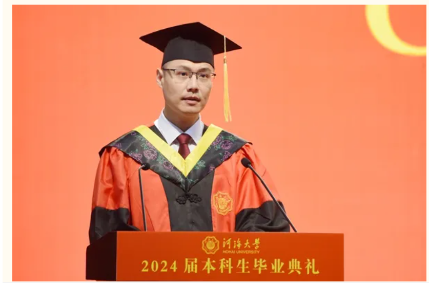 教师代表、农业科学与工程学院朱成立教授向毕业生们顺利完成学业表示祝贺,对毕业生为母校付出的努力和作出的贡献表示感谢,并寄语毕业生应当谨记作为河海人的责任和担当,以“无我”的境界去矢志报国,以“大我”的格局去实现价值,用“超我”的勇气去攻坚克难。