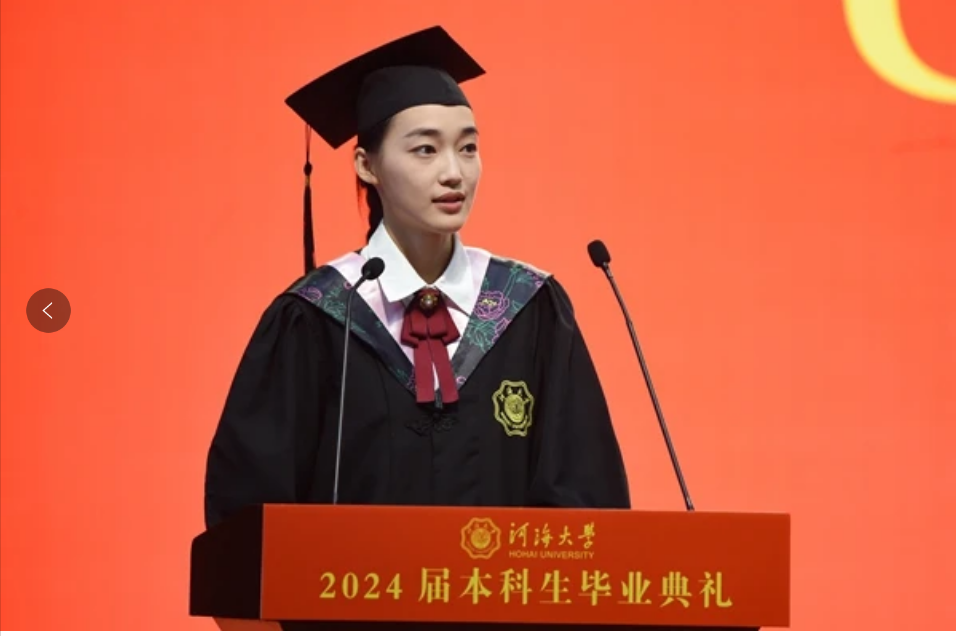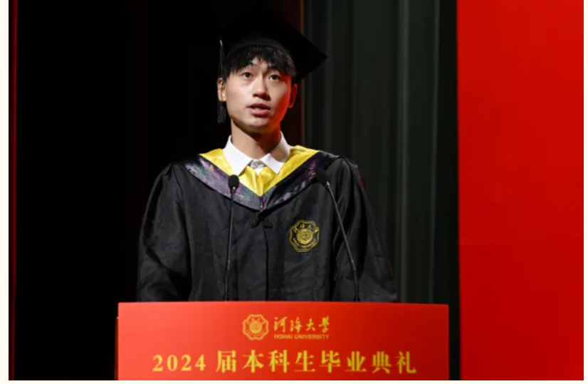 毕业生代表商学院会计学专业沈骁越同学和信息科学与工程学院通信工程专业于力涵同学表达了对母校的依依惜别之情和对老师们的感激之情,表示在人生新征程上将始终秉承河海校训精神,坚定地将小我融入大我,以真才实学服务人民,以创新创造贡献国家,谱写无悔的青春之歌!