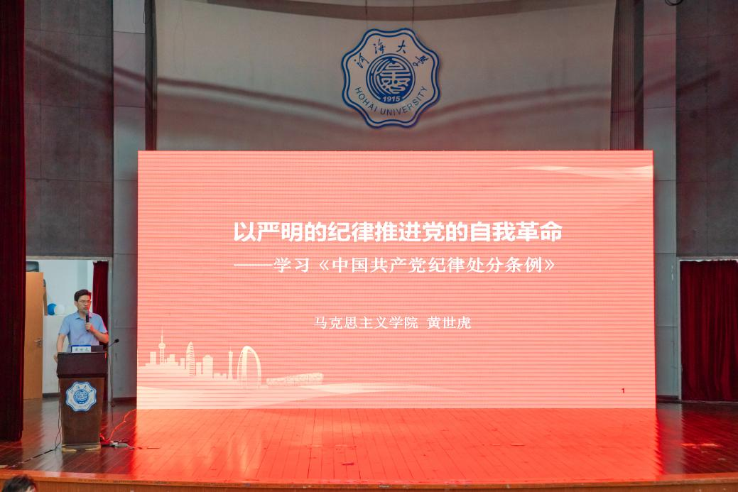 开班典礼后,马克思主义学院党委书记黄世虎教授开展“严明的纪律推进党的自我革命——学习《中国共产党纪律处分条例》”主题报告会,他从如何跳出历史周期律的窑洞之问切入,深入浅出地说明了新时代加强党纪教育的历史原因,阐明《中国共产党纪律处分条例》修改的五大特点,用鲜明的事例展示出《中国共产党纪律处分条例》字字千钧。最后,黄教授向学员们提出了学习要求,鼓励1442工程学员积极向党组织靠拢,以更高的党员标准严格要求自己,将纪律学习贯彻落实到具体学习、工作和生活中。