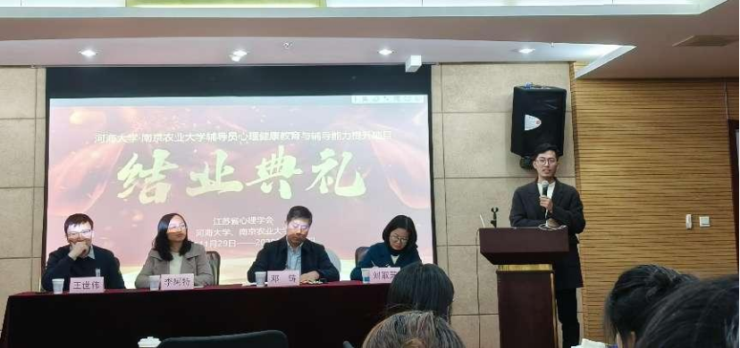 江苏省心理学会理事长、南京师范大学心理学院邓铸教授在结业典礼上讲话。他分析了当代大学生的心理特点和年龄特征,并结合自己的工作经历指出,辅导员是大学生在大学期间最亲密、最信任的人,要充分发挥辅导员的育人功能,引导学生学会学习、学会做人、学会共处,帮助大学生成为具有独立问题解决能力的成年人,从而更好地适应社会。