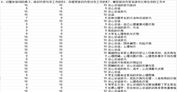 经过精心设计,培训项目得到了辅导员老师们的一致认可。辅导员老师们“对培训的整体满意度”均分9.39分,“培训内容和您工作契合度”均分9.54分,“你感觉培训内容对你工作的帮助程度”平均分9.54分。老师们一致认为,基础培训可以让他们更好地理解学生,而实操培训中谈心谈话对今后工作的帮助最大,其次是危机预警及干预和心理问题评估,团体辅导也备受好评。