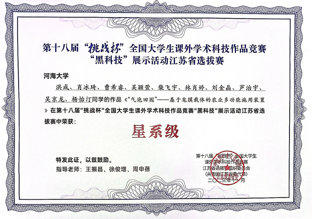 “科学研究要勇于探索,勇于创新,这个是关键”,这是袁隆平院士对创新的理解。在具有足够的知识储备及专业技能后,洪成和他的搭档们在王振昌副教授、徐俊增教授等老师的指导下,结合当下农业农村现代化、设施农业升级的大背景,针对果蔬等经济作物授粉劳动量大、花费大的难题,首次提出将泡泡授粉与现有的节水灌溉系统相结合,通过改进现有设备,创新了温室、果园内灌溉、授粉、喷药智能一体化控制装置,并取得各类竞赛全国特等奖3项、全国二等奖1项及多项省级奖项。