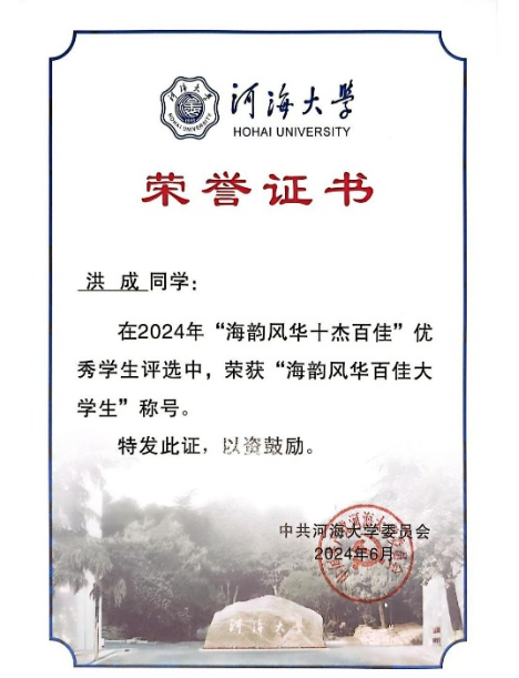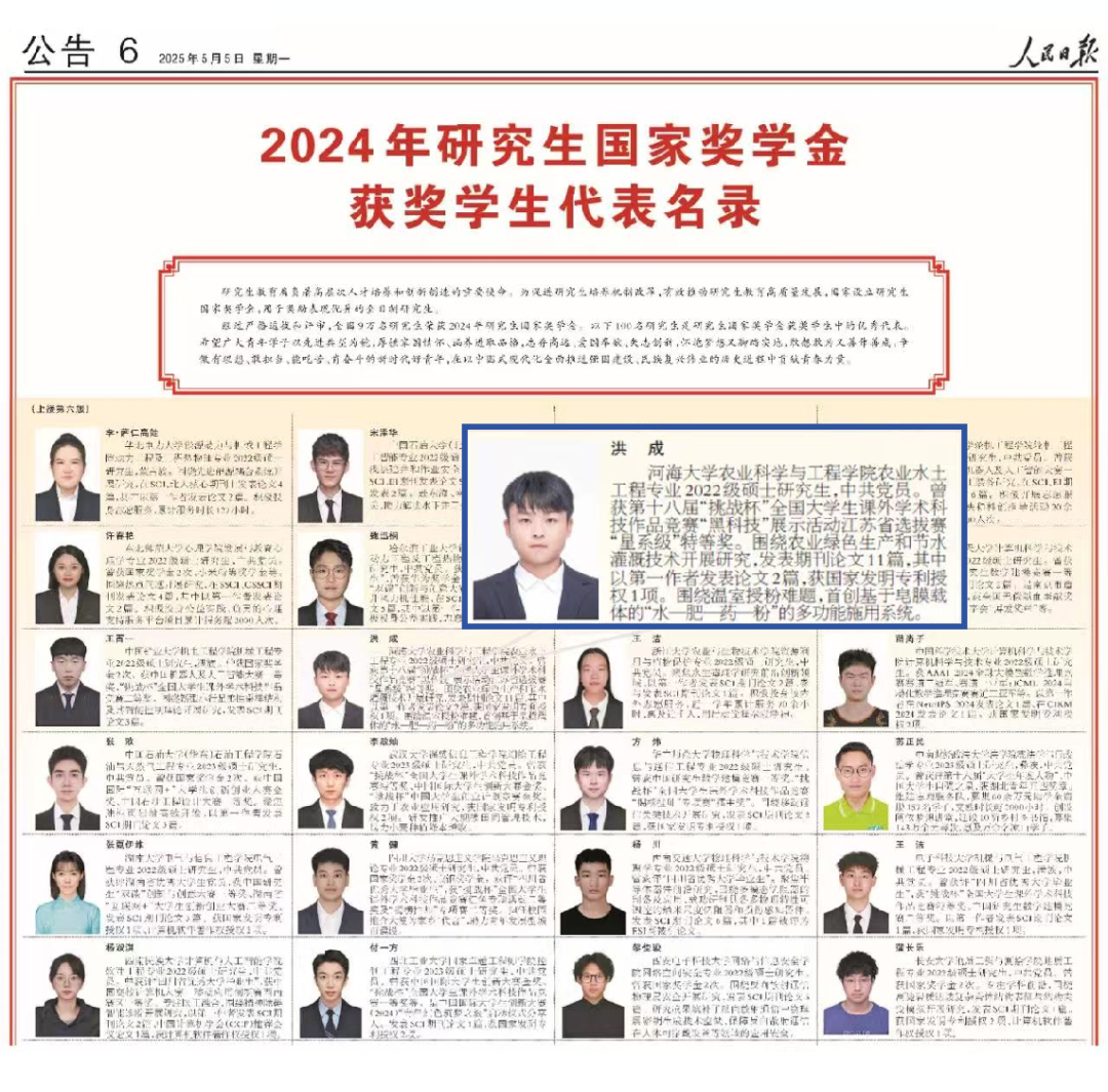 5月5日,人民日报发布《国家奖学金获奖学生代表名录》。经过严格选拔和评审,2024年全国共评选出9万名优秀国家奖学金获奖学生,再从中评选出100名学生,作为获奖学生的优秀代表。今年,我校农业水土工程专业研究生洪成光荣入选名录,这是河海学子第二次入选,也是AG凯发K8国际“研究生国家奖学金”获得者的首次入选。